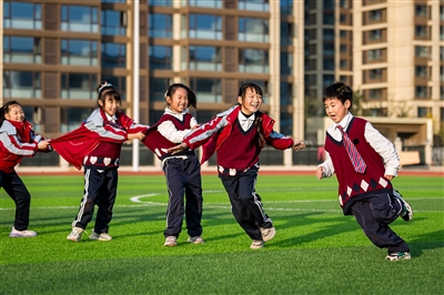 安陽縣安東第一實驗學(xué)校充分利用大課間開展體育活動。圖為學(xué)生在操場上玩老鷹抓小雞游戲。王建安 攝